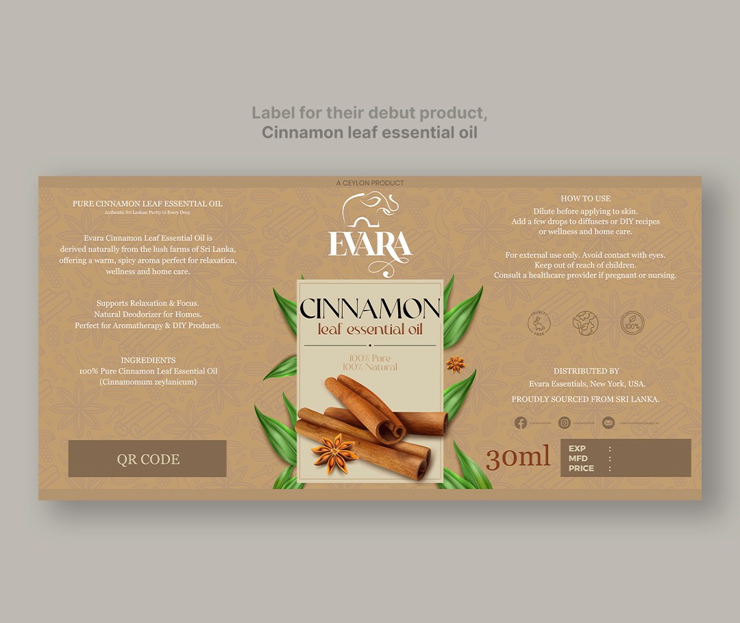 I also designed the product label for their debut item, Cinnamon Leaf Essential Oil. The client had a clear vision for the label, and through close collaboration and several revisions, I delivered a final design that met their expectations.
