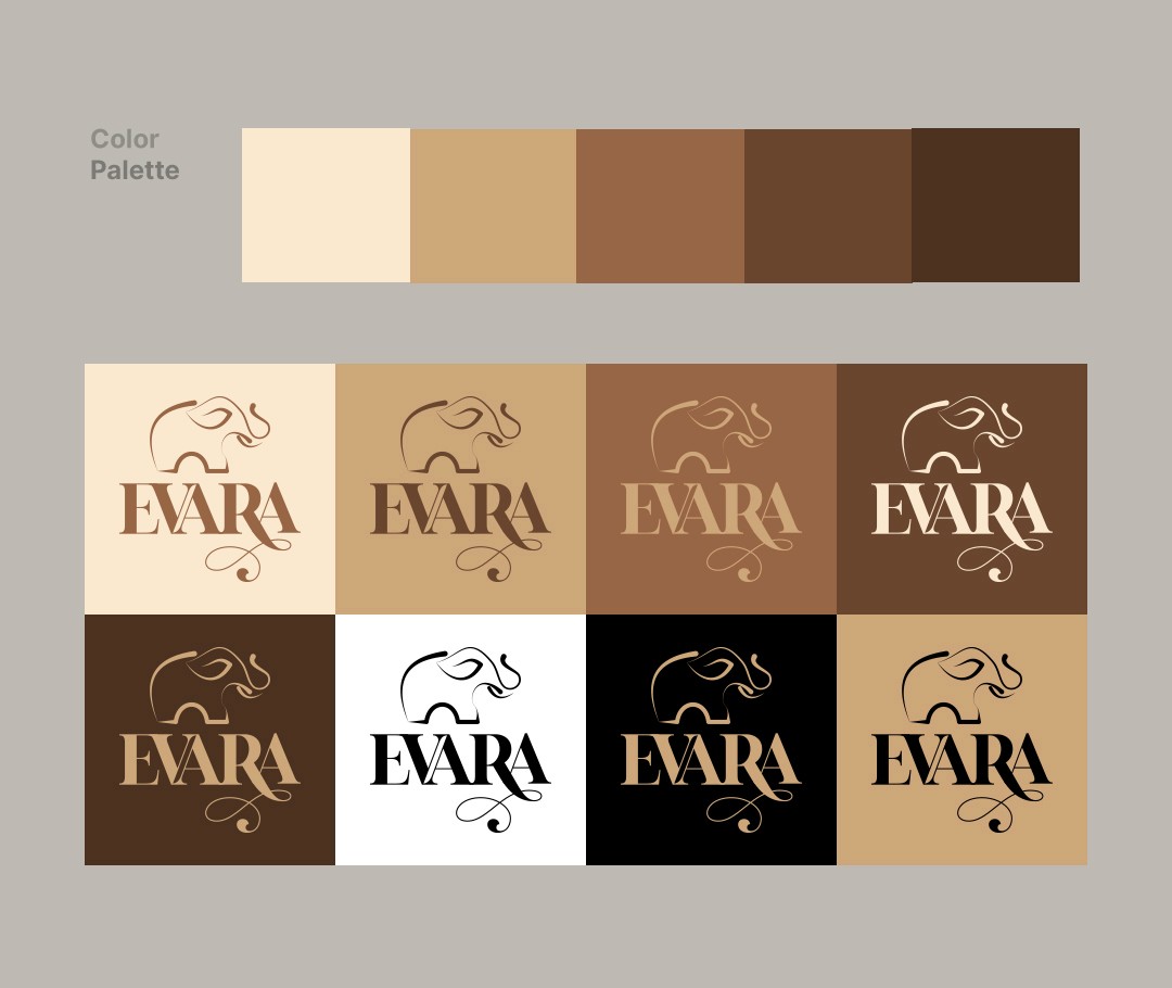 For the logo design, I created a logo mark that reflects their identity, featuring an elephant to represent their Sri Lankan roots and a leaf as the elephant’s ear to symbolize their nature based, herbal products. The wordmark uses a serif font to convey a sense of luxury and exclusivity, with a unique extension on the letter “R” to introduce a free flowing, natural feel.